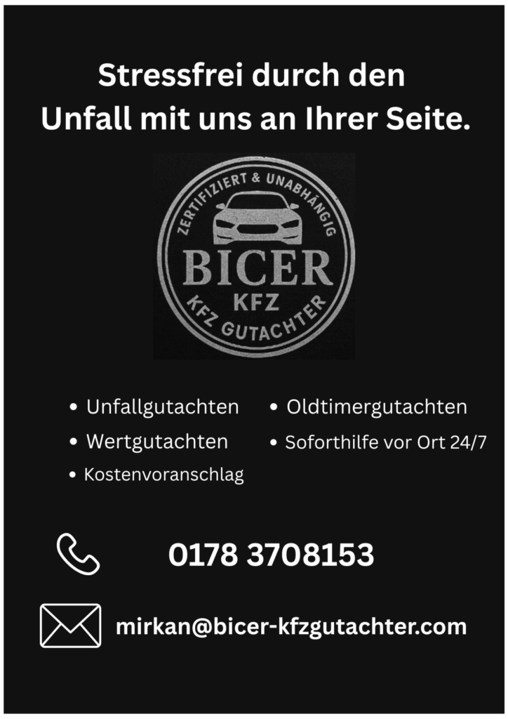 KFZ Gutachter Bicer steht für professionelle und kundennahe Fahrzeugbewertung mit schneller Hilfe, auch wenn es mal nicht werktags ist. Unser Ziel ist es, Ihnen verlässliche Gutachten zu bieten, damit Sie sicher unterwegs sind.